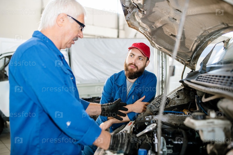 Молодой бородатый работник технического обслуживания смотрит на своего зрелого коллегу