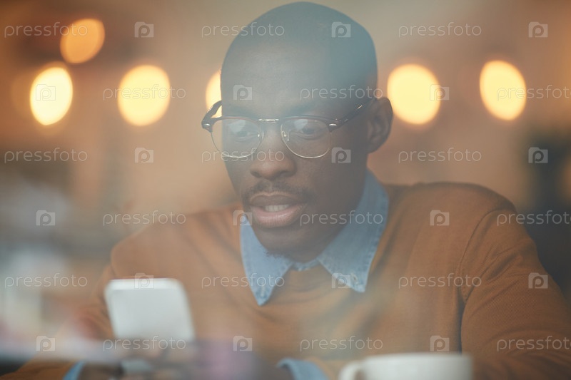 Афроамериканский мужчина использует смартфон в пабе