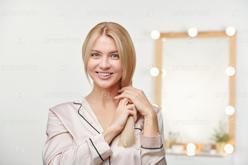 Красивая улыбающаяся женщина в шелковой пижаме, держащая свои длинные светлые здоровые волосы