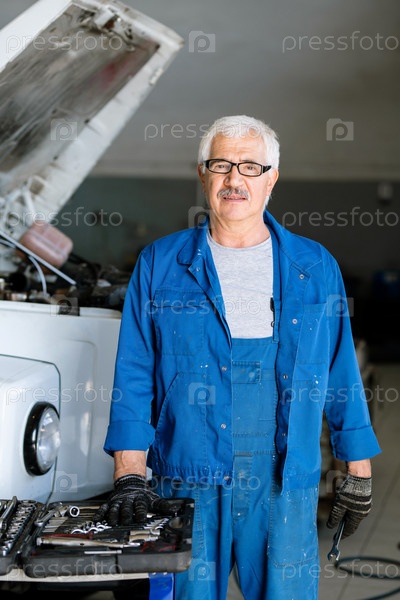 Пожилой и опытный мастер технического обслуживания смотрит на камеру