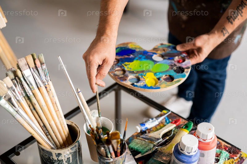 Художник держит палитру с смешанными цветами и кладет кисть в воду