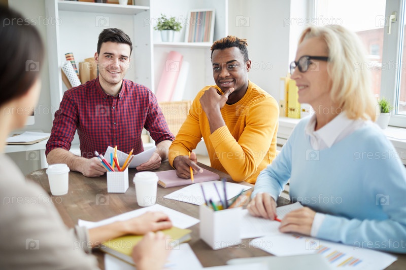 Веселая творческая команда мультиэтнических специалистов, сидящих за столом с чашками кофе и бумагами и мозговой штурм о маркетинговой стратегии на встрече