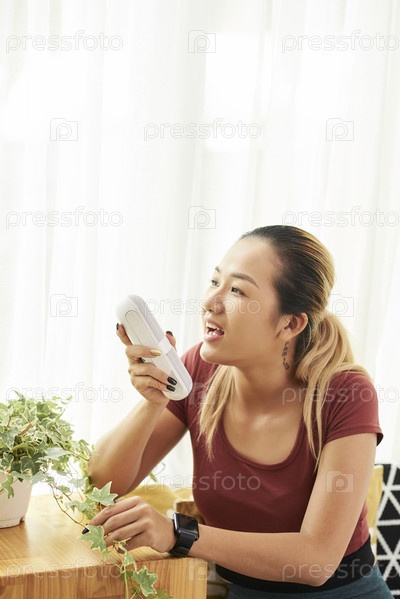 Молодая женщина с портативным динамиком