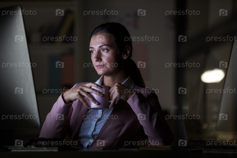 Женщина, работающая допоздна с кофе