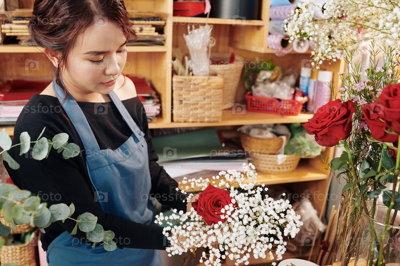 Молодая женщина устраивает цветы в букете