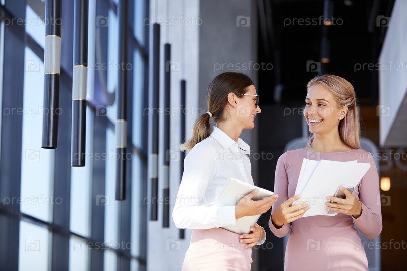 Веселые молодые бизнес-леди в розовой одежде стоят в фойе офиса и смотрят отчет, обсуждая деловые вопросы