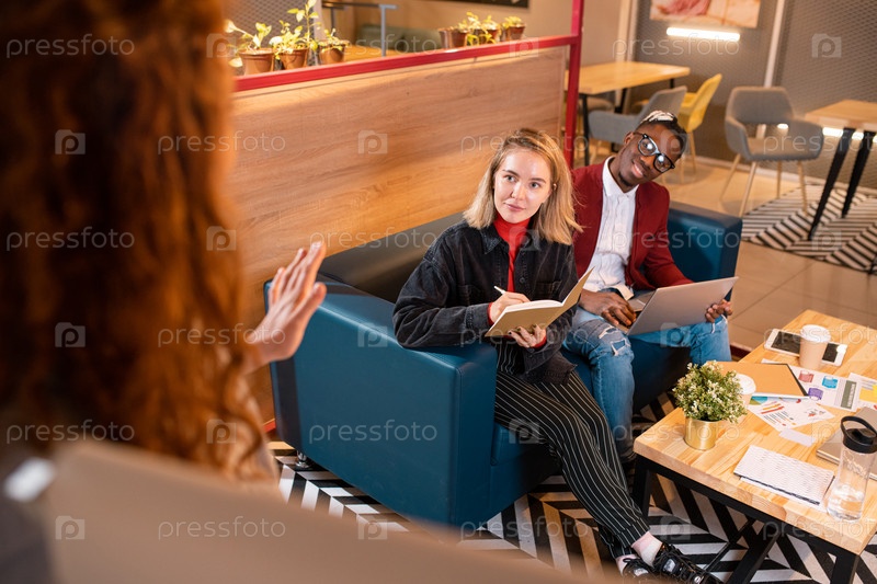 Два межкультурных коллеги в повседневной одежде слушают презентацию спикера