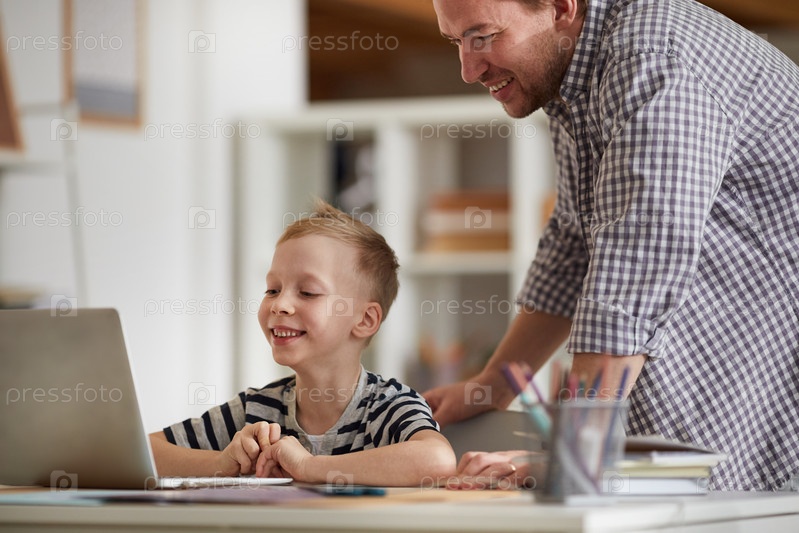 Веселый милый мальчик сидит за столом и смотрит на экран ноутбука с отцом, пока они используют современное компьютерное приложение для образования