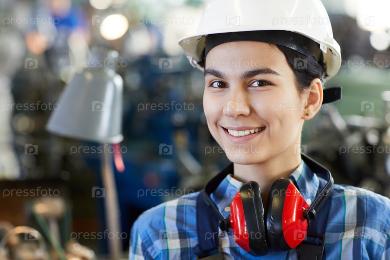 Портрет улыбающейся красивой молодой леди-работницы в жесткой шляпе, носящей красные защитники ушей на шее, женщина в концепции промышленности