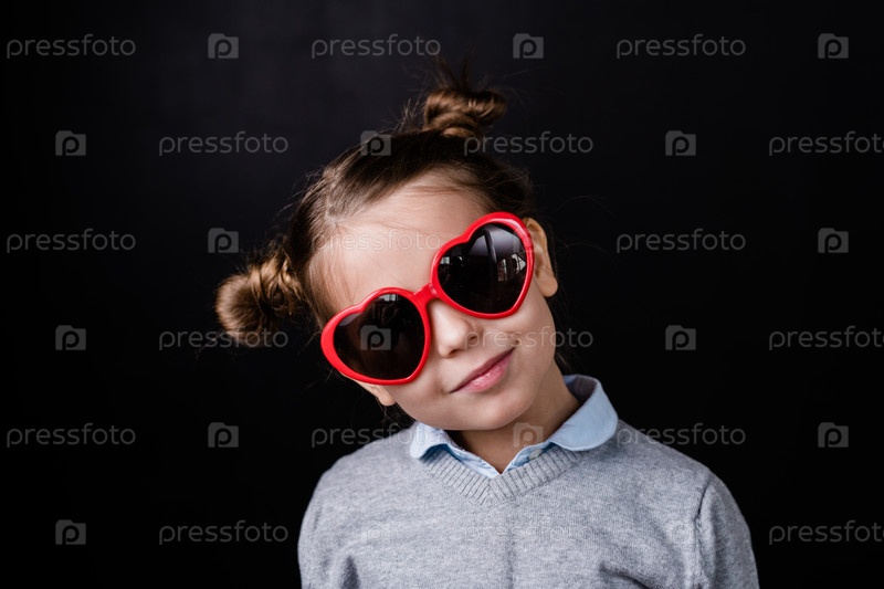 Милая девушка в солнцезащитных очках с линзой в форме сердца стоит перед камерой