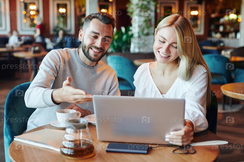 Улыбающийся парень делает презентацию своей красивой девушке или товарищу по группе в кафе