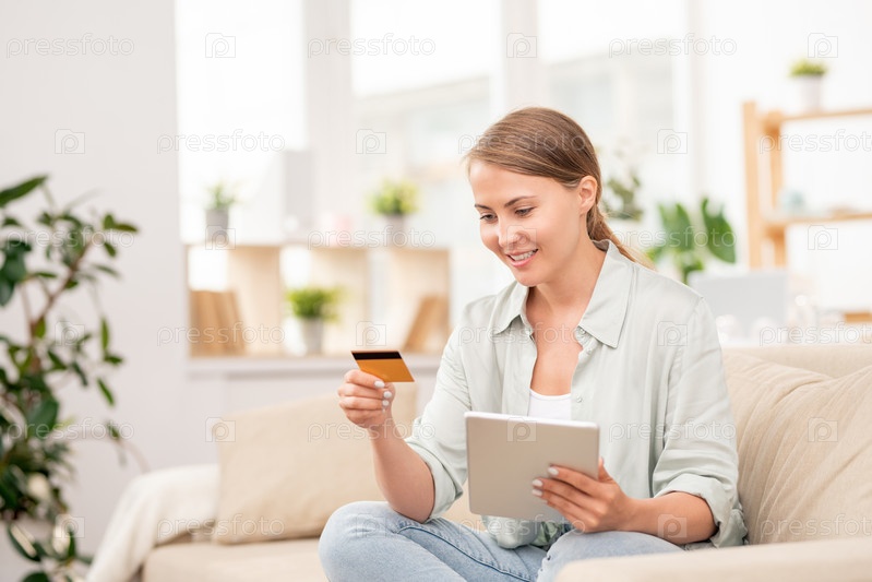 Молодая случайная покупательница с пластиковой картой собирается заплатить за онлайн-заказ