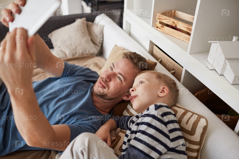 Улыбающийся привлекательный молодой отец со стержнем, лежащим на кровати и использующим портативное устройство во время создания автопортрета с сыном, вытягивающим язык