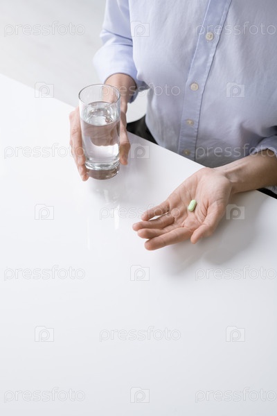Руки больной женщины или бизнес-леди будут иметь стакан воды и таблетку