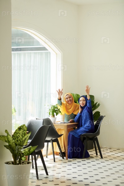 Веселые женщины машут в камеру