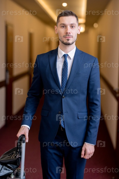 Молодой успешный бизнесмен в формальной одежде стоит в длинном коридоре отеля