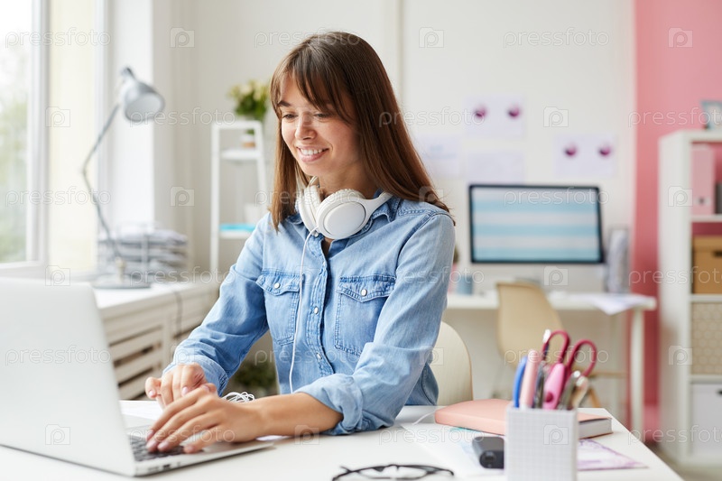 Оптимистичная молодая сотрудница офиса в джинсовой рубашке с наушниками на шее, сидящая за столом и редактирующая документ на ноутбуке