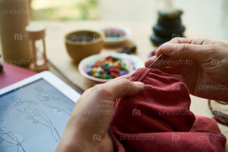 Женщина, делающая ручное платье