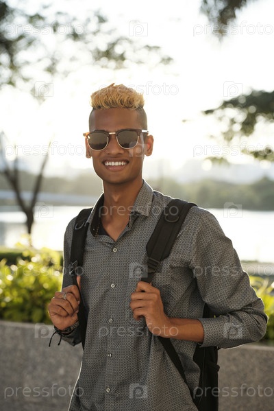 Счастливый студент колледжа стоит на улице