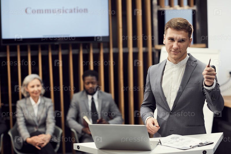 Контент красивый молодой менеджер в сером костюме, стоящий за столом речи с ноутбуком и жестом руки во время работы со зрителями на конференции