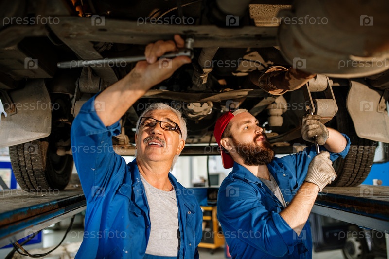 Молодые и зрелые техники автосервиса по ремонту автомобилей фиксируют детали автомобильного мотора
