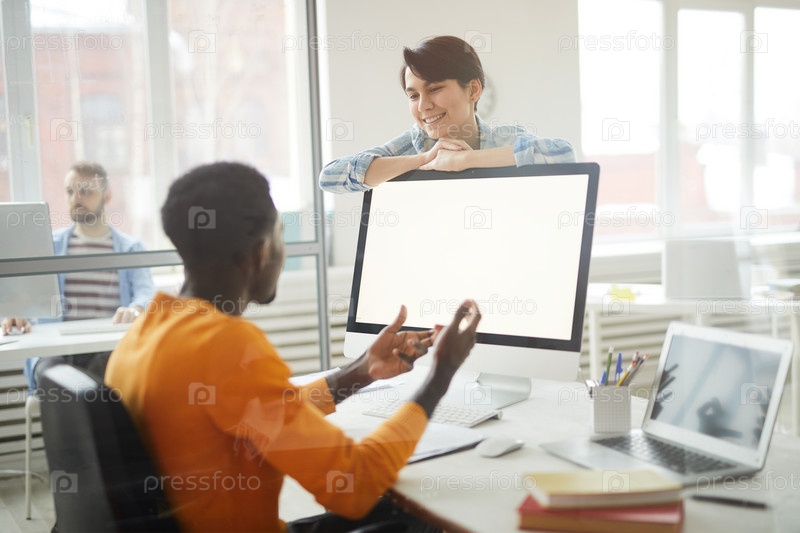 Улыбающиеся коллеги, разговаривающие в офисе