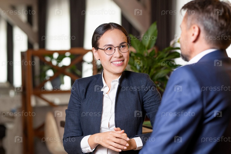 Довольно молодой веселый агент в формальной одежде и очках разговаривает с клиентом