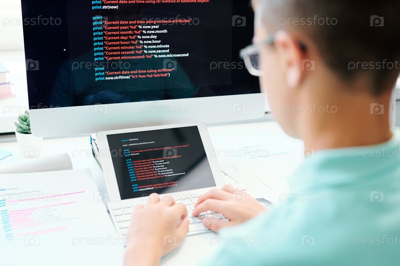 Молодой мужчина сидит у рабочего места, нажимая кнопки клавиатуры компьютера