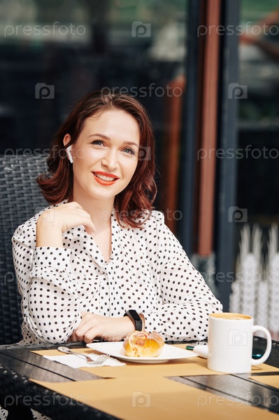 Красивая бизнесвуменка, сидящая за столом в кафе