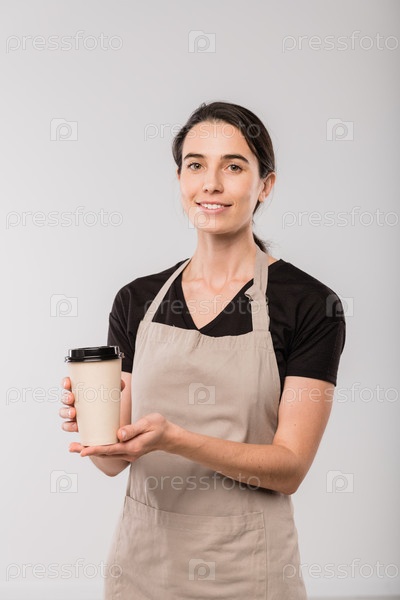 Молодая официантка кафе в фартуке, дающая тебе бокал горячего кофе в изоляции