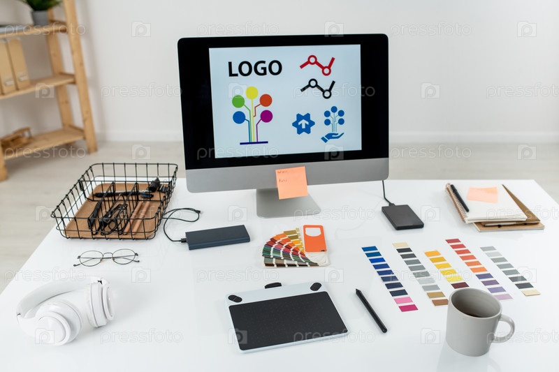 Монитор компьютера с логотипом на экране, графический планшет и другие вещи на столе