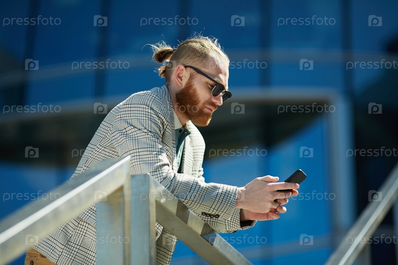 Загруженный хипстер-мужчина, отправляющий смс