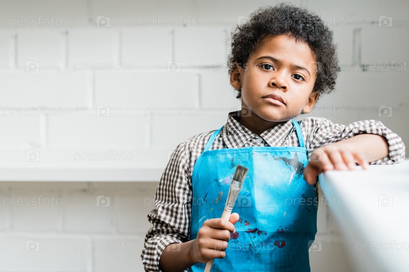 Серьезный африканский школьник в синем фартуке, держащий кисть в руке