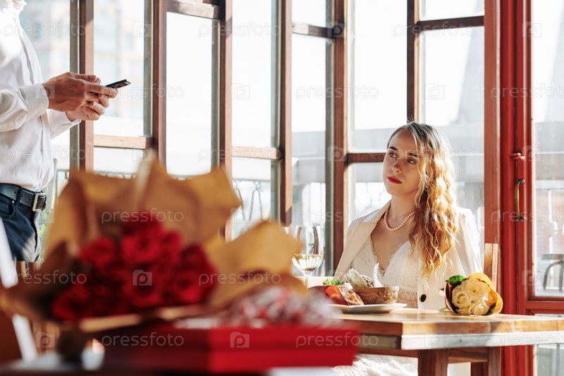 Женщина смотрит на своего бойфренда, который пишет сообщения