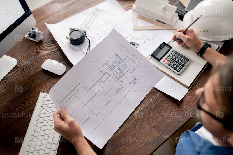 Бумага с эскизом в руках инженера, который смотрит на чертеж и делает заметки