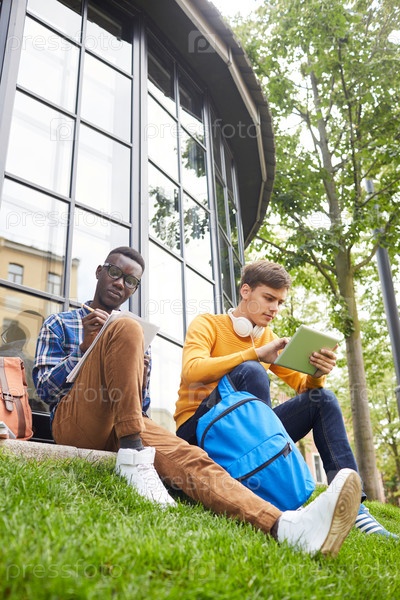 Два студента сидят на газоне