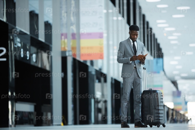 Чернокожий бизнесмен смотрит на паспорт и билет