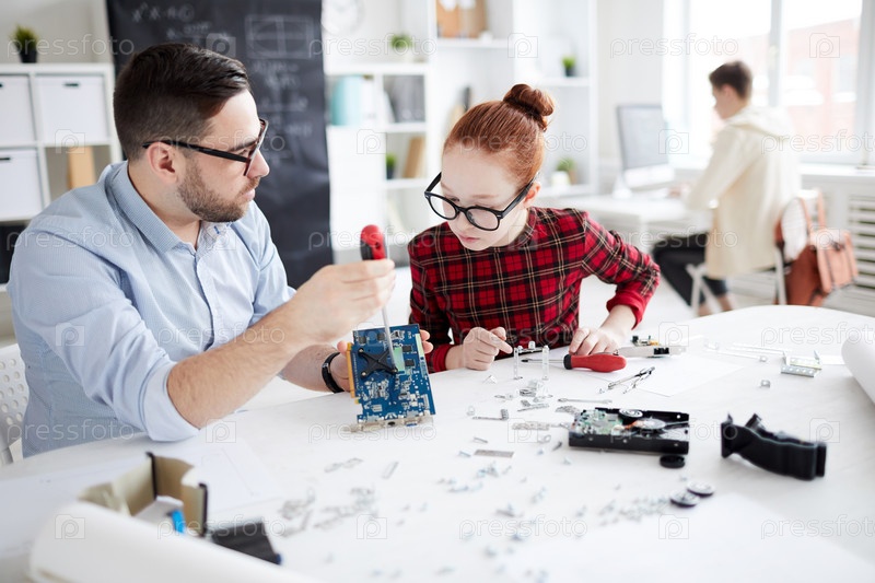 Серьезный красивый молодой учитель сидит за столом и показывает любознательной девушке, как починить материнскую плату