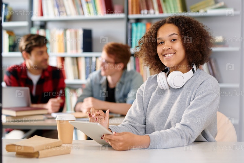 Юный веселый студент с планшетом готовится к экзамену