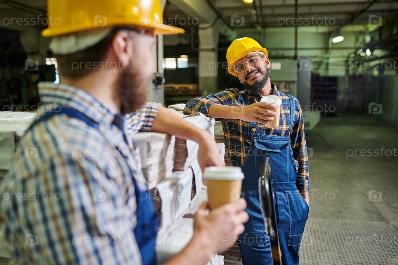 Улыбающиеся молодые мультиэтнические рабочие в жестких шляпах, опираясь на кучу упакованных газет на складе типографии и пьющие кофе из одноразовой чашки во время перерыва