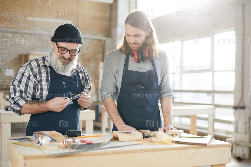 Содержимое старшего серых бородатых плотников и его помощника, использующих калибр при измерении деревянных деталей в мастерской