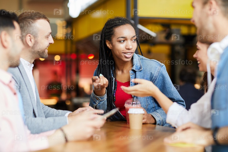 Группа молодых студентов из разных этнических групп в непринужденной одежде, сидящих за столом и пьющих напитки во время беседы в кафе