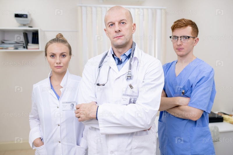 Группа из трех серьезных молодых и зрелых профессиональных клиницистов в форме
