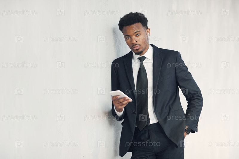 Портрет серьезного молодого красивого чернокожего бизнесмена с бородой, прислонившегося к стене и использующего смартфон для прослушивания аудиосообщений в наушниках