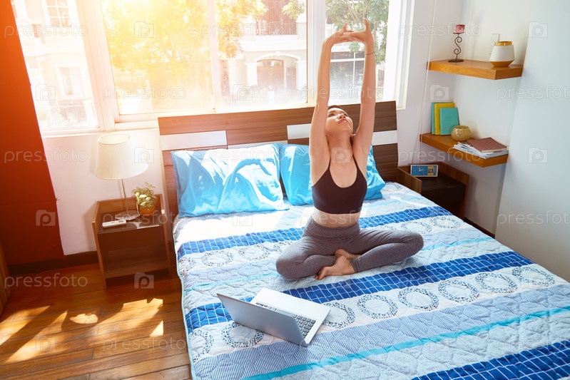 Женщина делает упражнения в спальне