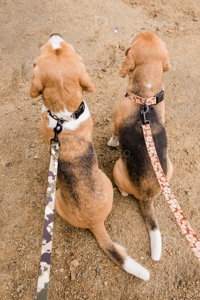 Обзор двух милых щенков чистокровного бигла, сидящих на песке