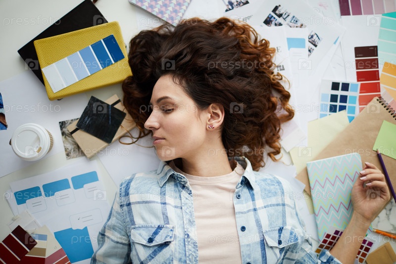 Красивая молодая женщина, лежащая в творческом беспорядке