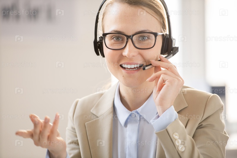 Уверенный оператор службы поддержки, разговаривающий через гарнитуру с микрофоном