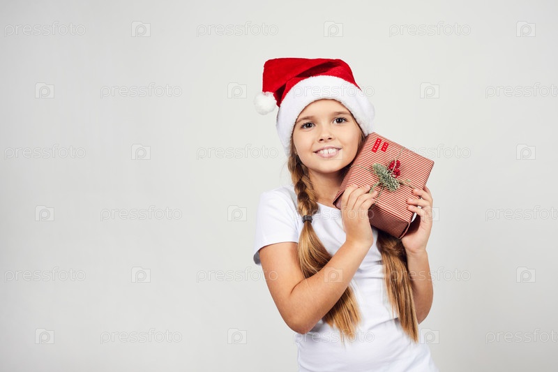 Веселая милая девочка в шляпе Санты, взволнованная рождественским подарком, стоит на белом фоне и держит хорошо упакованную подарочную коробку