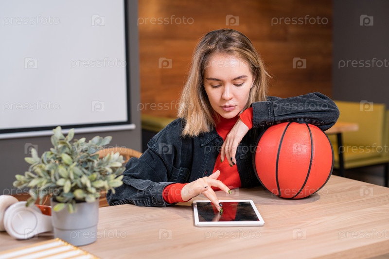 Молодая блондинка в повседневной одежде сидит в кафе и прокручивает на сенсорной панели
